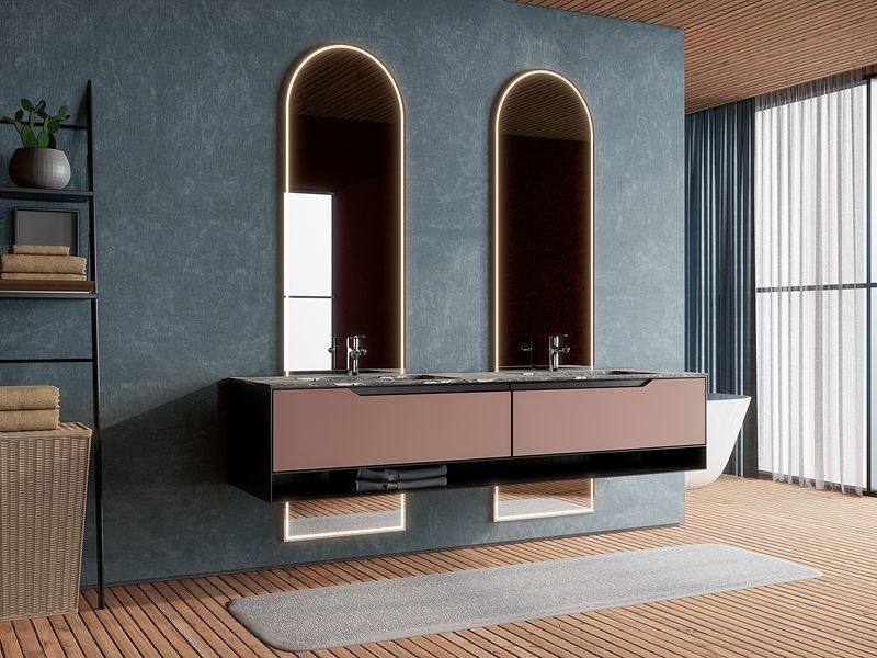 Questa vanità per il bagno è presentata come un sistema guidato dal design piuttosto che un SKU generico.Utilizza una palette di finiture controllata insieme alla struttura di armadi in acciaio inossidabile Premium per creare un'identità visiva più risoluta per progetti residenziali premium.