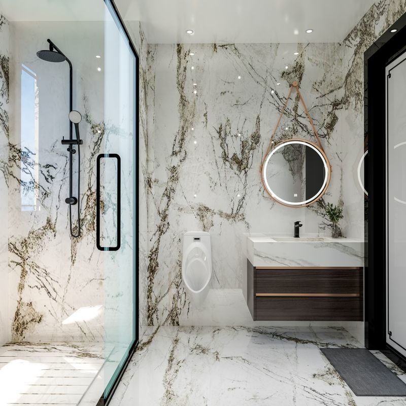 | Pannelli Parete e Pavimento | Marmo venato bianco e nero, che esalta l'estetica generale con un tocco di lusso |