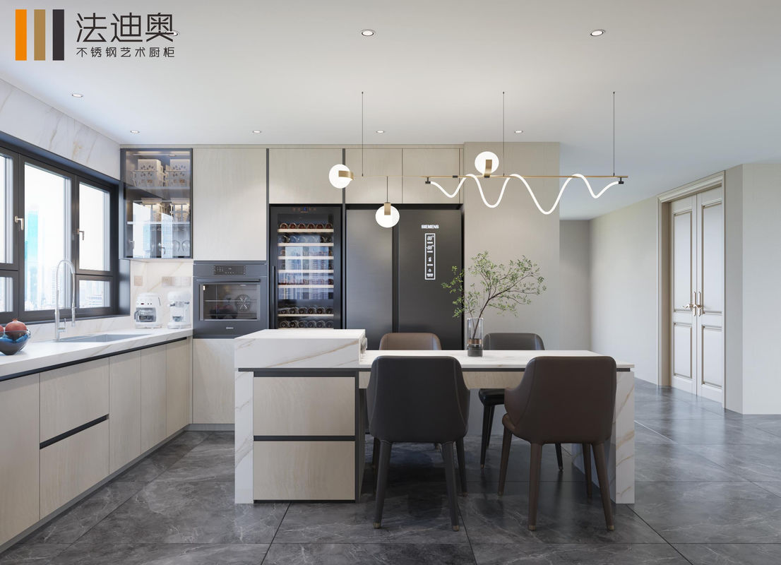 Questo armadietto da cucina personalizzato è costruito attorno a una strategia di finitura differenziata: Grano di legno abbinato alla struttura dell'armadietto in acciaio inossidabile.Questa combinazione dà agli acquirenti un'espressione di lusso più calda senza perdere la pulizia e la durata del progetto attesi dagli armadi in acciaio inossidabile.