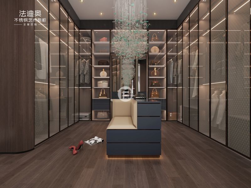 Questo guardaroba personalizzato è costruito attorno a una strategia di finitura differenziata: Wood Grain / Blue abbinato alla struttura del gabinetto in acciaio inossidabile.Questa combinazione dà agli acquirenti un'espressione di lusso più calda senza perdere la pulizia e la durata del progetto attesi dagli armadi in acciaio inossidabile.