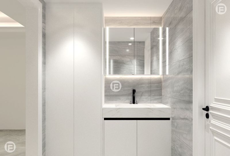 Questo mobile da bagno è presentato come un sistema guidato dal design piuttosto che come un SKU generico. Utilizza il Bianco insieme a una struttura di armadi in acciaio inossidabile Premium per creare un'identità visiva più definita per progetti residenziali di lusso.