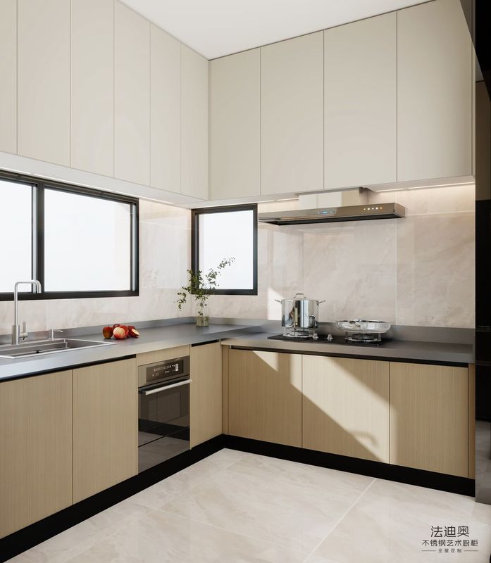 Questo armadietto da cucina personalizzato è costruito attorno a una strategia di finitura differenziata: Grano di legno abbinato alla struttura dell'armadietto in acciaio inossidabile.Questa combinazione dà agli acquirenti un'espressione di lusso più calda senza perdere la pulizia e la durata del progetto attesi dagli armadi in acciaio inossidabile.