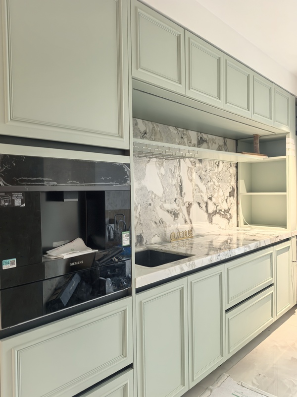 Questo mobile da cucina è presentato come un sistema guidato dal design piuttosto che come un SKU generico. Utilizza Beige / Verde insieme a una struttura di mobili in acciaio inossidabile per creare un'identità visiva più definita per progetti residenziali di lusso.