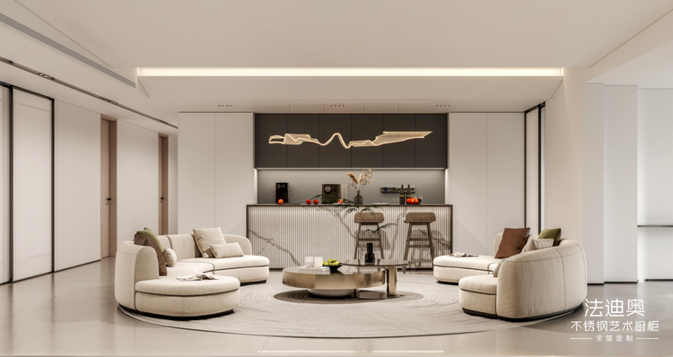 Questo armadietto da cucina è presentato come un sistema guidato dal design piuttosto che un SKU generico.Utilizza il bianco insieme alla struttura dell'armadio in acciaio inossidabile per creare un'identità visiva più risoluta per i progetti residenziali premium.
