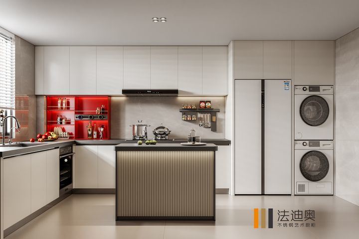 Questo mobile da cucina è presentato come un sistema guidato dal design piuttosto che come un SKU generico. Utilizza il bianco insieme a una struttura di mobili in acciaio inossidabile per creare un'identità visiva più definita per progetti residenziali di lusso.