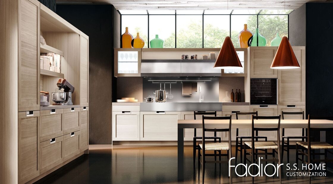 | Combinazione di Colori | Mobili in legno naturale chiaro abbinati a superfici in acciaio inossidabile |