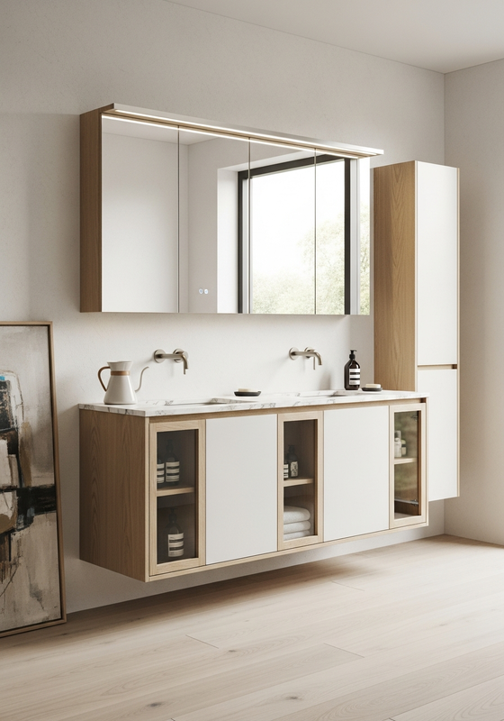 | Material & Performance304 food-grade stainless steel structural system with quarter-sawn European white oak veneer exterior, matte white lacquer accent panels, clear float glass vitrine sections supports moisture resistance, finish stability, and long-term daily use in master bathroom, guest ensuite, hospitality powder rooms, architect-designed residential projects seeking restrained material expression. That matters when buyers need architectural appearance without wood-based maintenance risk. |
