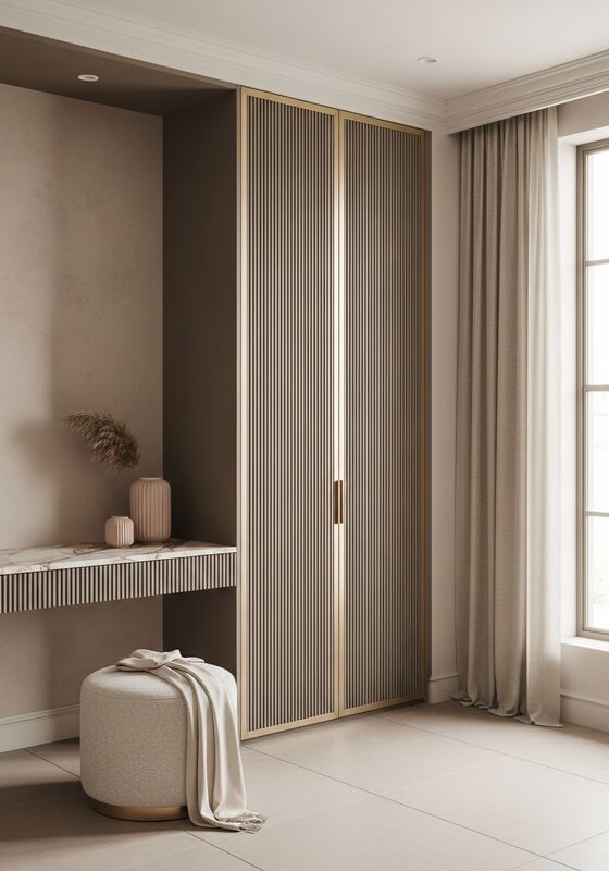 | I punti salienti del designMinimalismo femminile morbido con una texture artigianale Toni compatibili con i drappi di champagne, morbidi accenti di marmo rosa, rivelazioni di champagne in oro metallico, proporzioni disciplinate e porte verticali a micro-flutto a 15 mm di passo che creano un ritmo di ombra delicato.La pagina dovrebbe essere letta come una specifica risolta, non una scatola di deposito generica. |