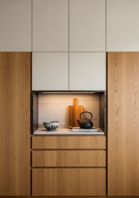 | Stile di design | Minimalismo Japandi con sottotoni wabi-sabi — linee pulite ammorbidite dal calore dei materiali, venature visibili e dettagli di lavorazione dei metalli fatti a mano |